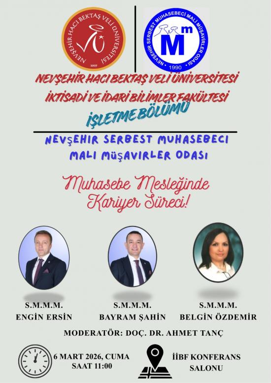 Nevşehir Hacı Bektaş Veli Üniversitesi İktisadi ve İdari Bilimler Fakültesi İşletme Bölümü ile Nevşehir Serbest Muhasebeci Mali Müşavirler Odası (Nevşehir SMMO) iş birliğinde, 01–07 Mart Muhasebe Haftası kapsamında “Muhasebe Mesleğinde Kariyer Süreçleri” başlıklı panel düzenlendi.